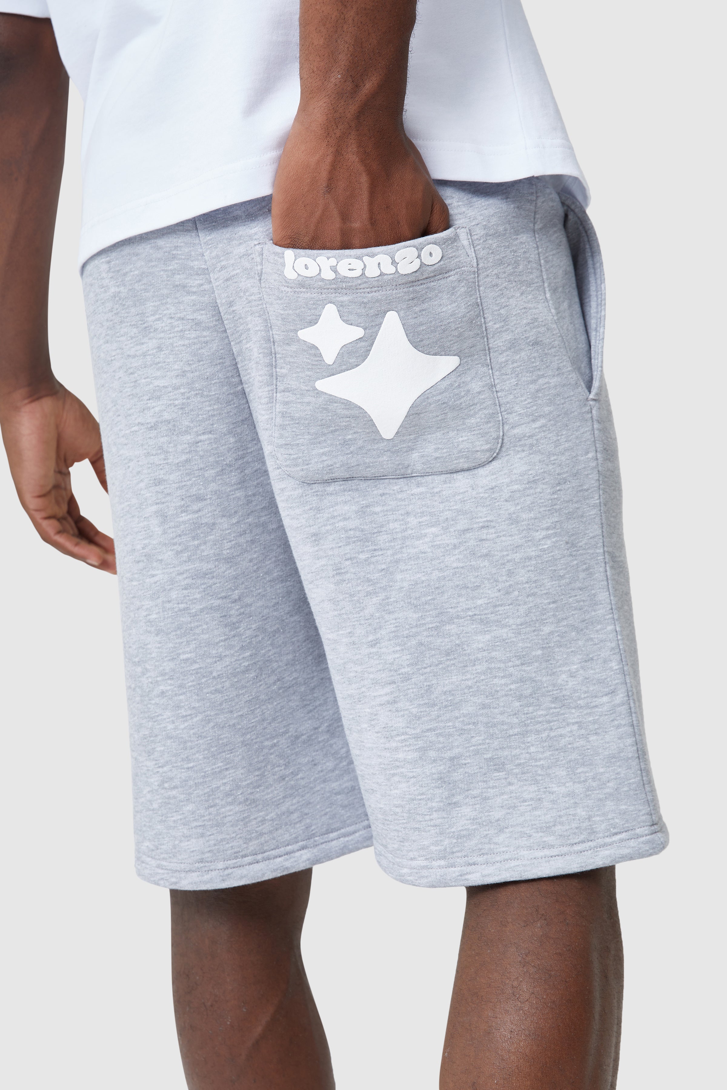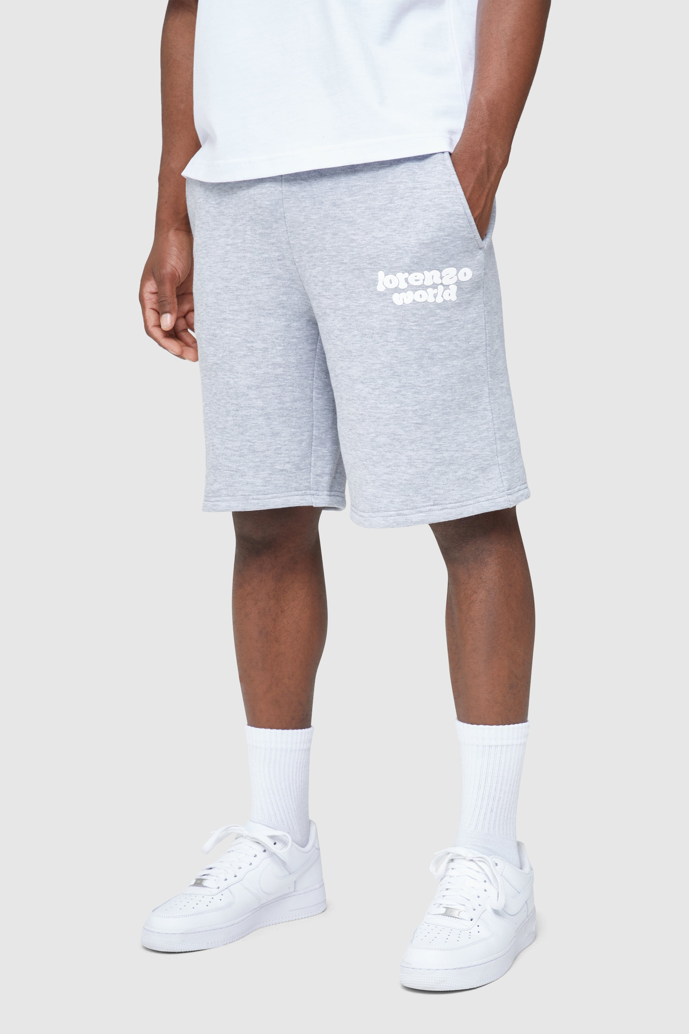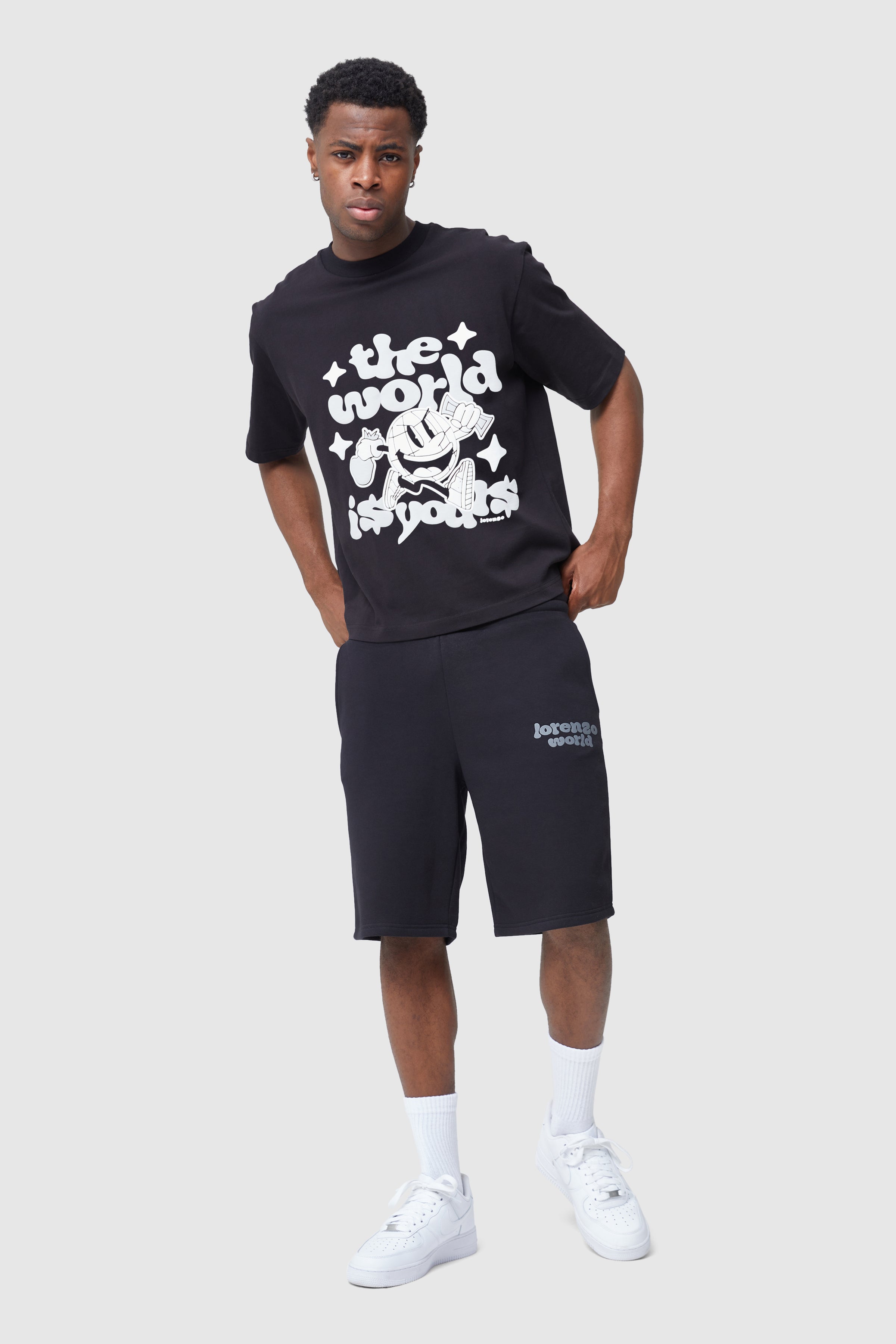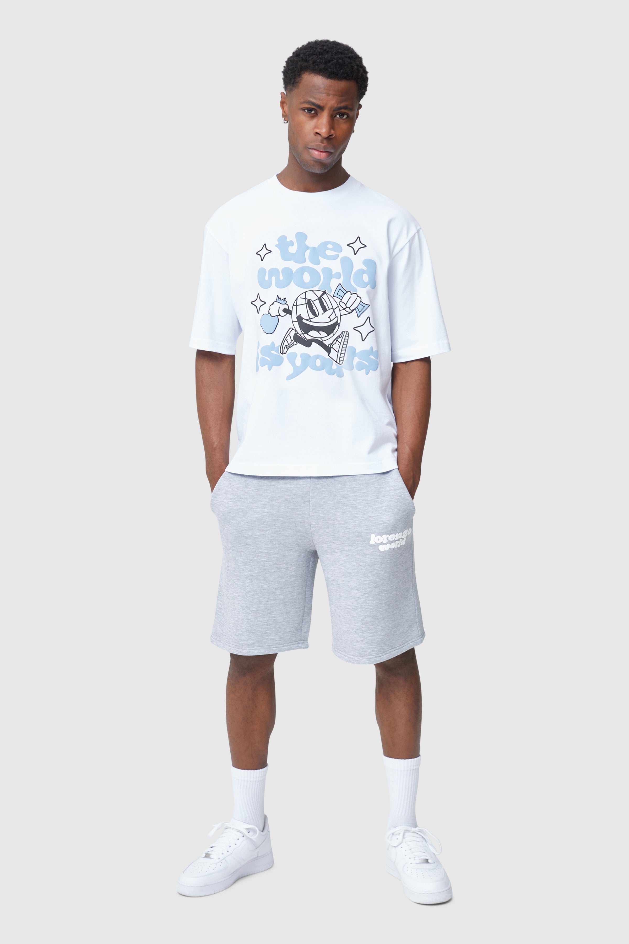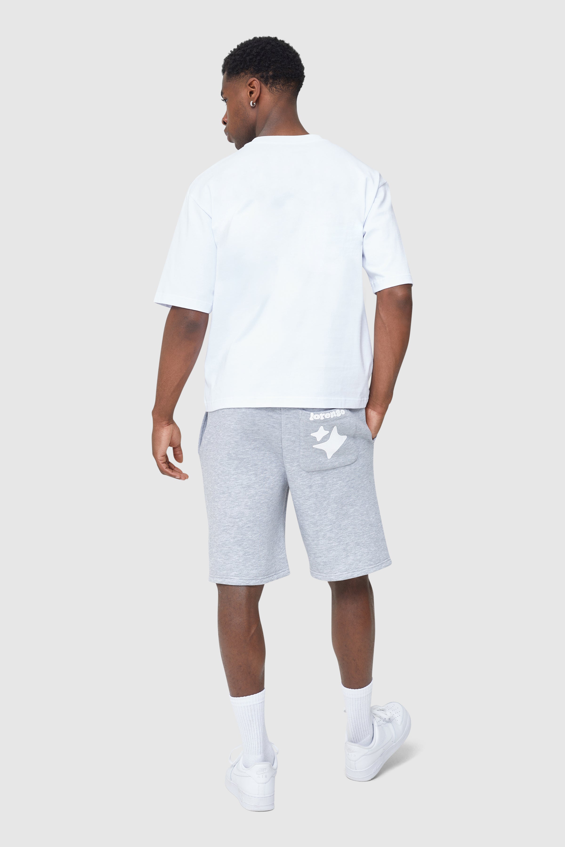 The World Is Yours Twinset. This product pairs the statement puff print tee with matching heavyweight shorts, designed for everyday wear with a premium feel. Finished in a clean Grey and White combo for effortless styling.